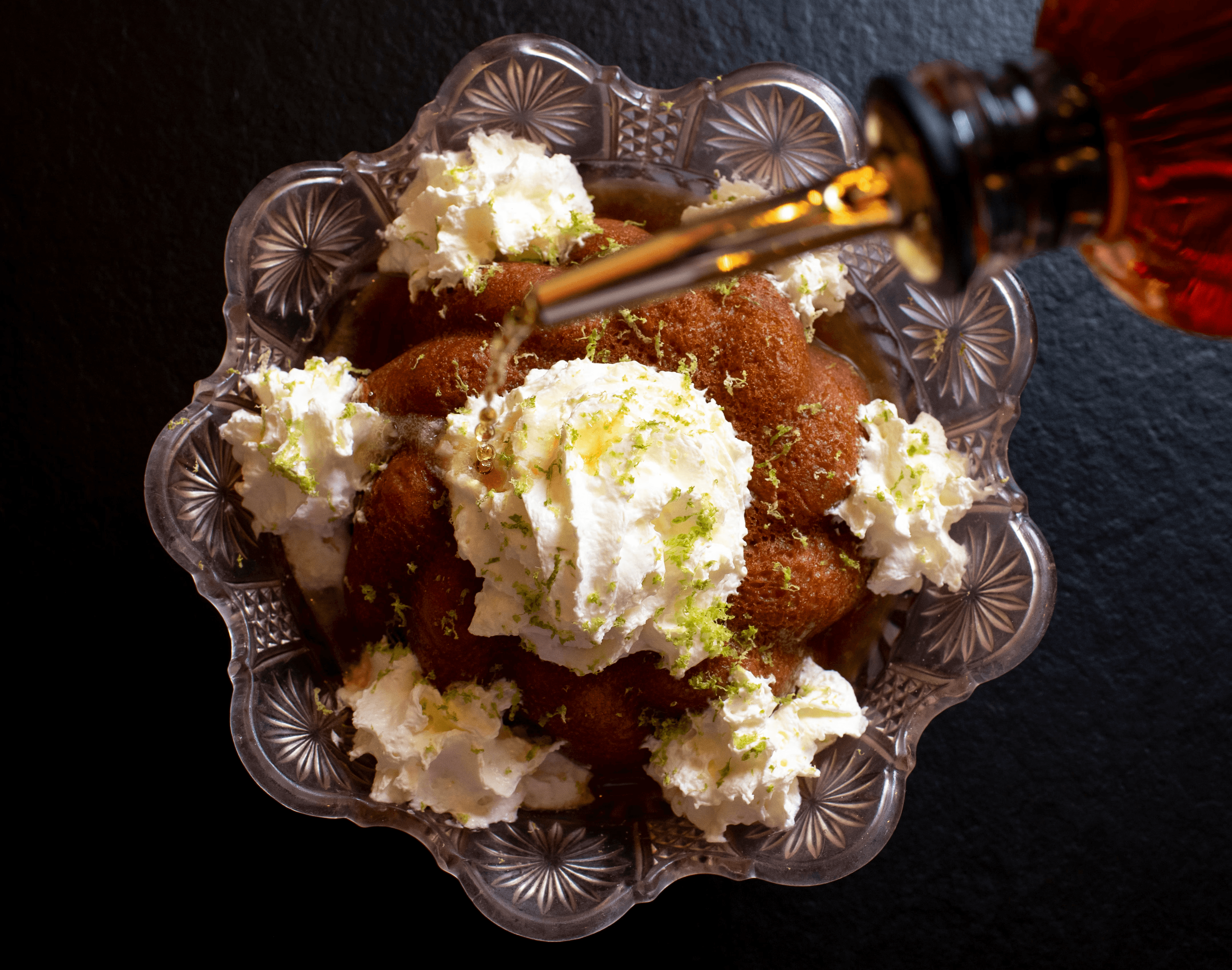 Savarin imbibé d'un sirop au rhum ambré servi avec de