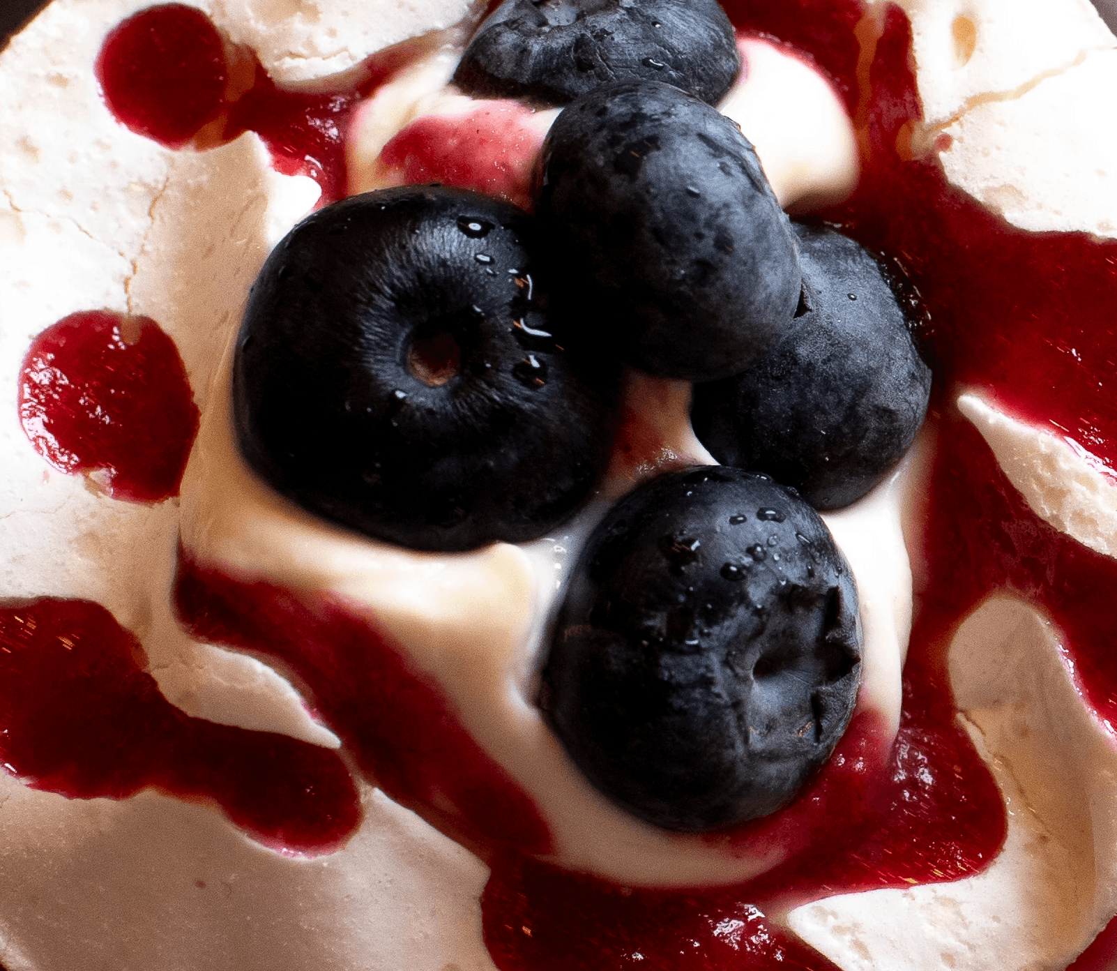 Meringue accompagnée de double crème et coulis à la Myrtille