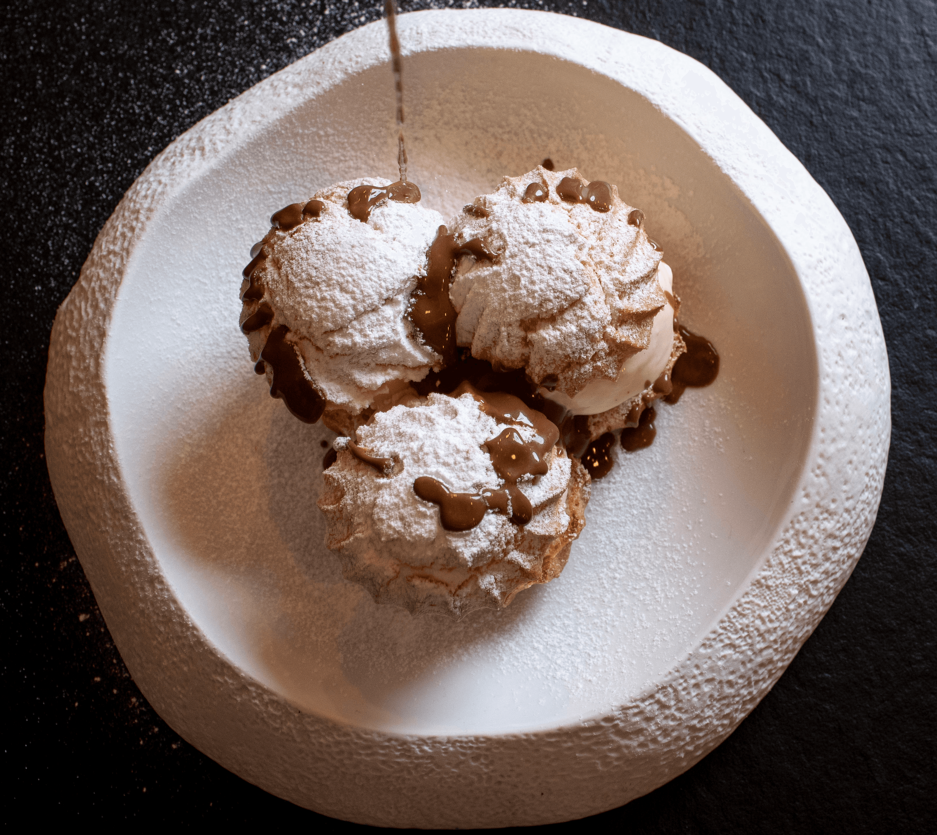 Choux garnis de glace vanille, nappés d’un onctueux chocolat et d’une touche de chantilly