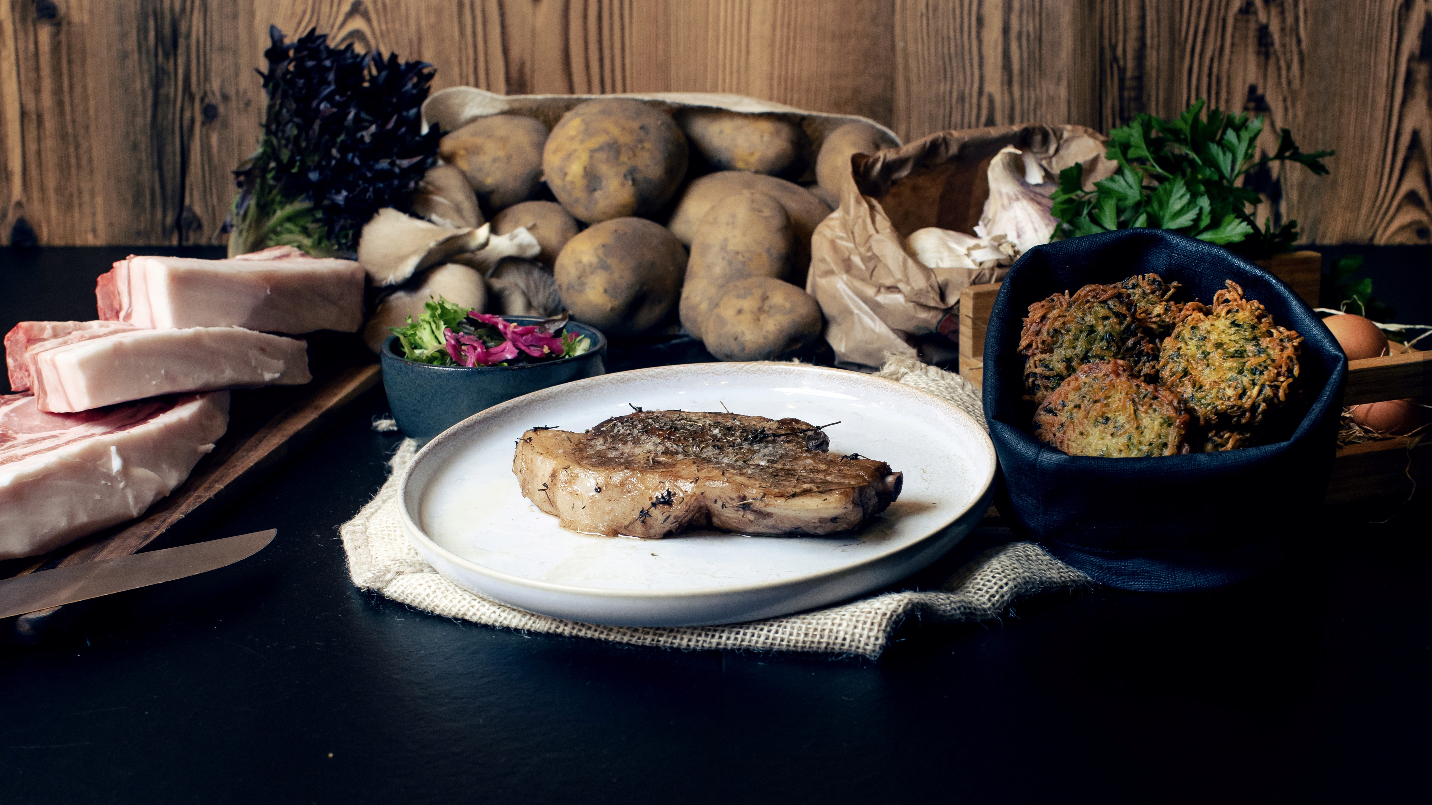 Côte de cochon cuit basse température, beignets de pommes de terre et salade verte