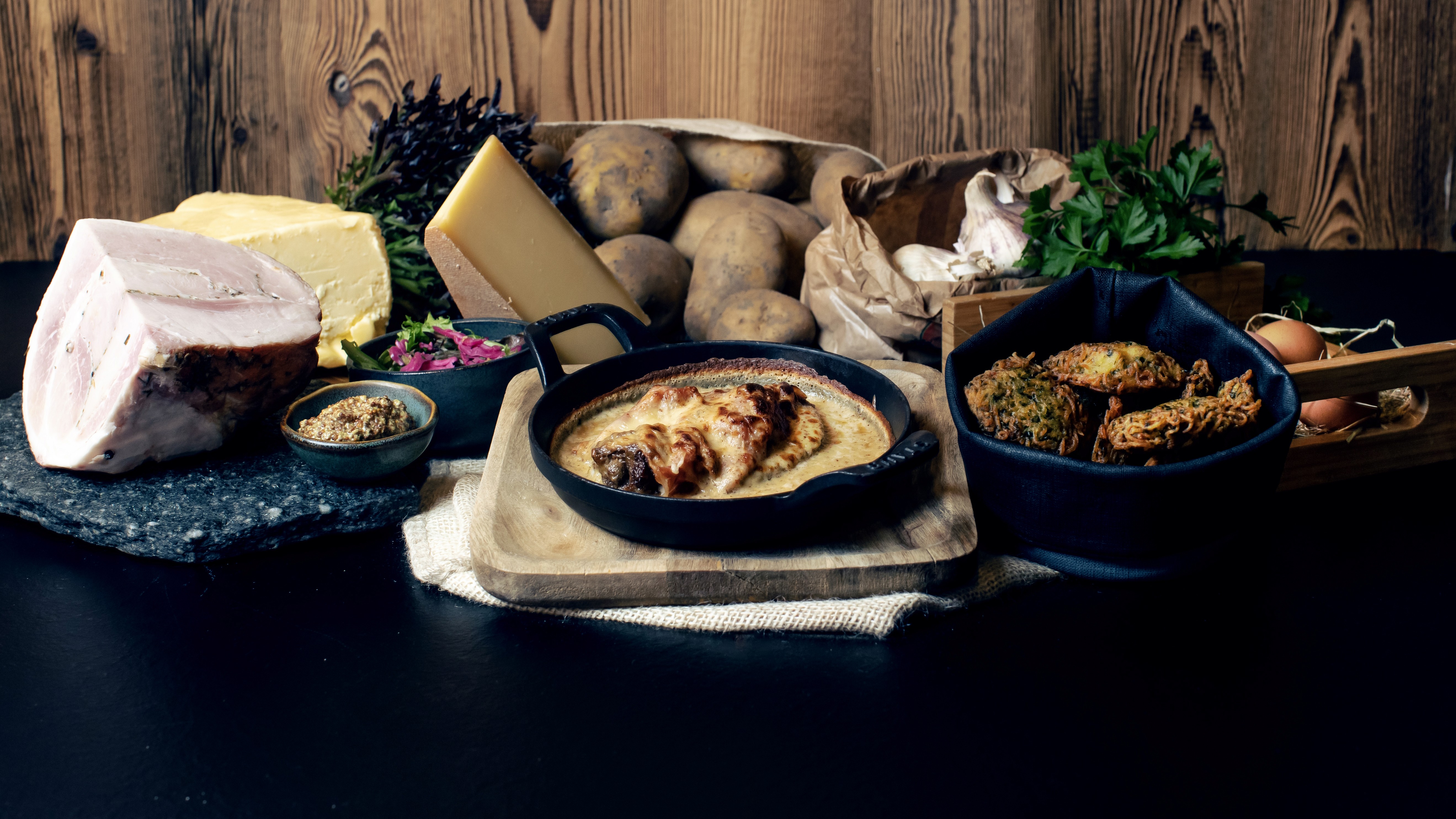 Charcuterie locale, Reblochon, Tomme Blanche, beignets de pommes de terre