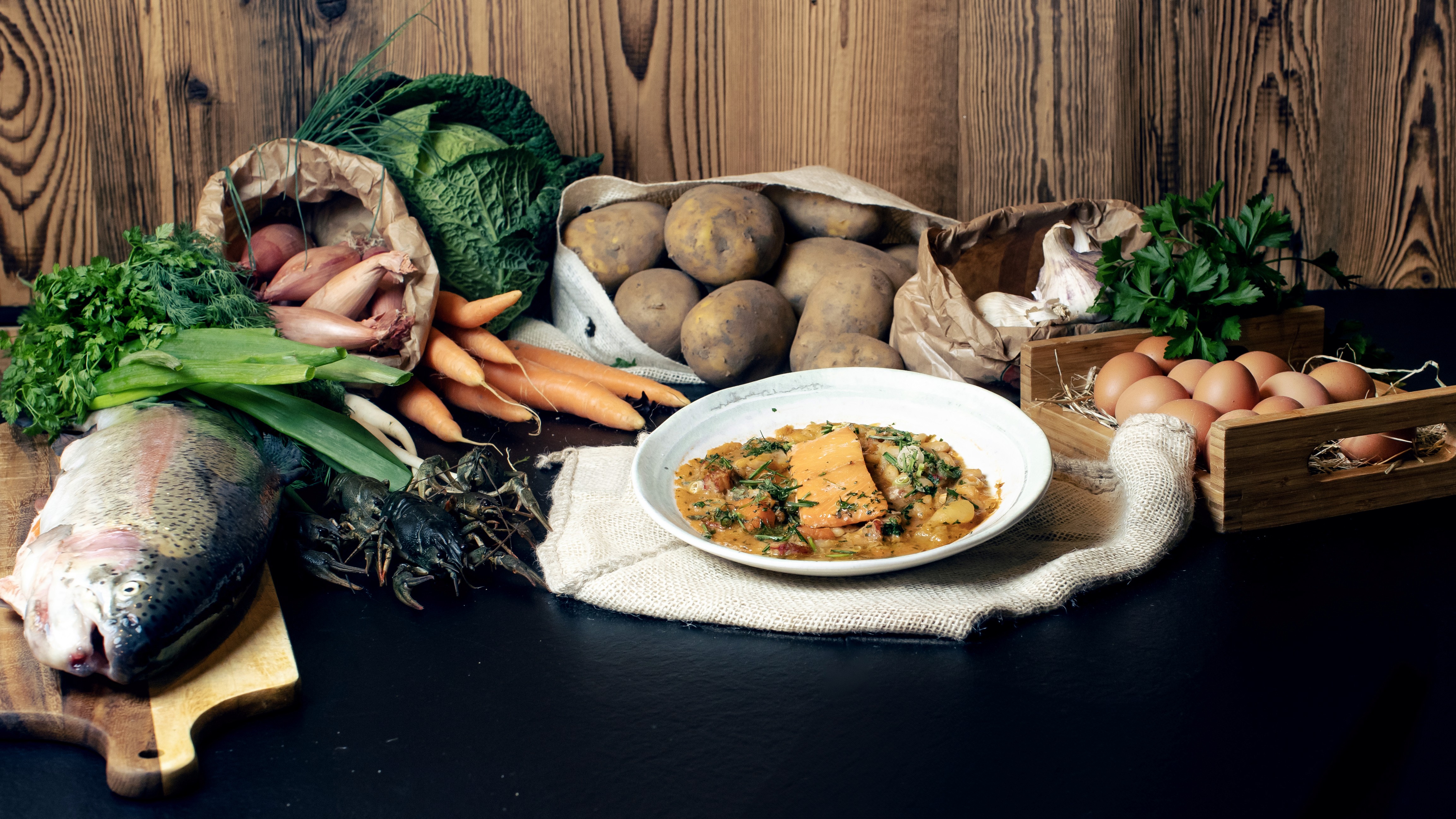 Garbure mijotée longuement avec les légumes du potager, écrevisses en court bouillon, filet de truite